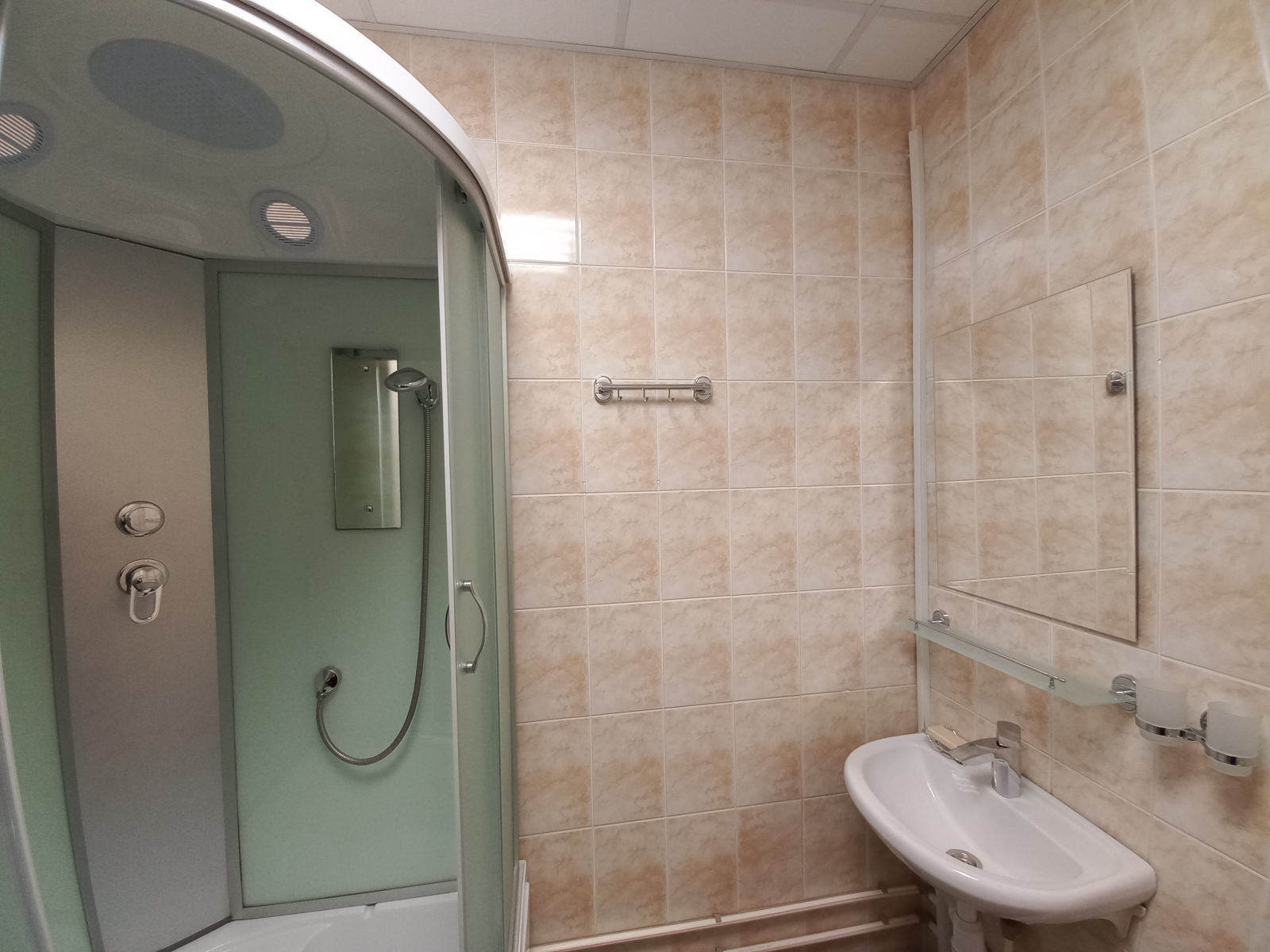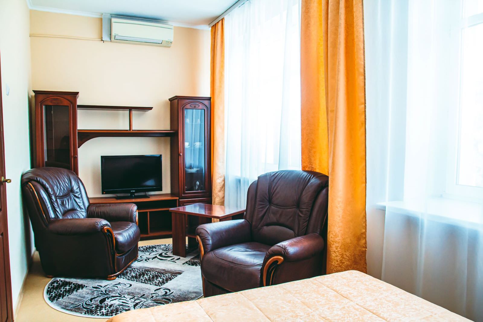 1 осн. место. 1 доп. место. Мебель: вешалка, зеркало, кровать двуспальная, прикроватные тумбочки, стол, стулья, шкаф. Оборудование: кондиционер, набор посуды, телевизор, телефон, холодильник, электрочайник. Санузел: с душем, туалетные принадлежности. Сервис: смена полотенец, смена постельного белья, уборка номера, услуги внутренней телефонной связи.