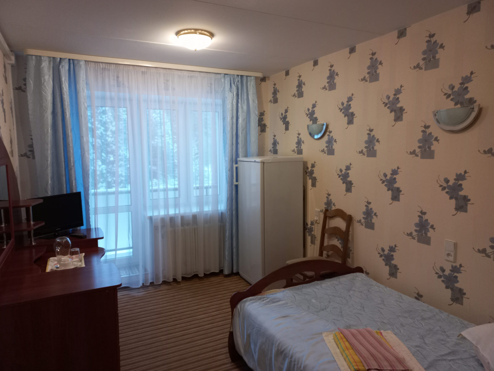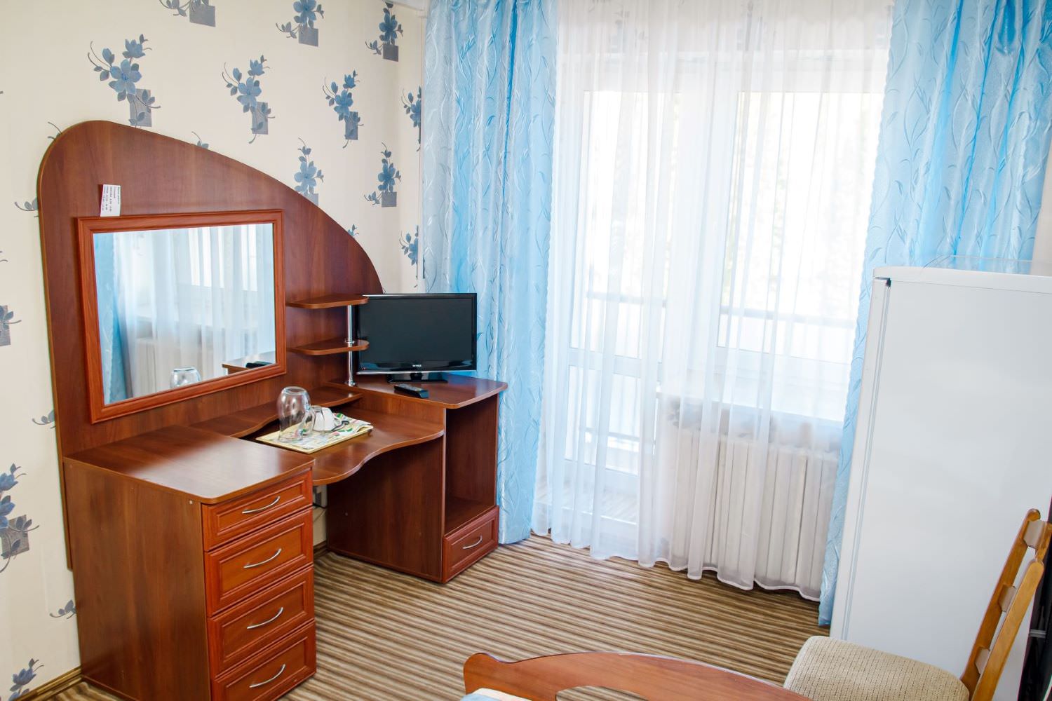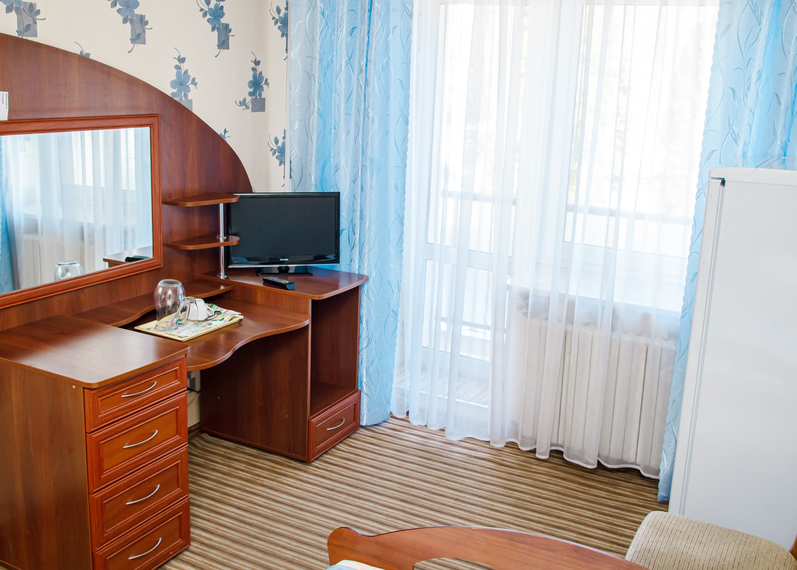 1 осн. место. 1 доп. место. Мебель: вешалка, зеркало, кровать односпальная, прикроватная тумбочка, стол, стул, шкаф. Оборудование: телевизор, холодильник, электрочайник. Санузел: с душем, туалетные принадлежности. Сервис: смена полотенец, смена постельного белья, уборка номера.